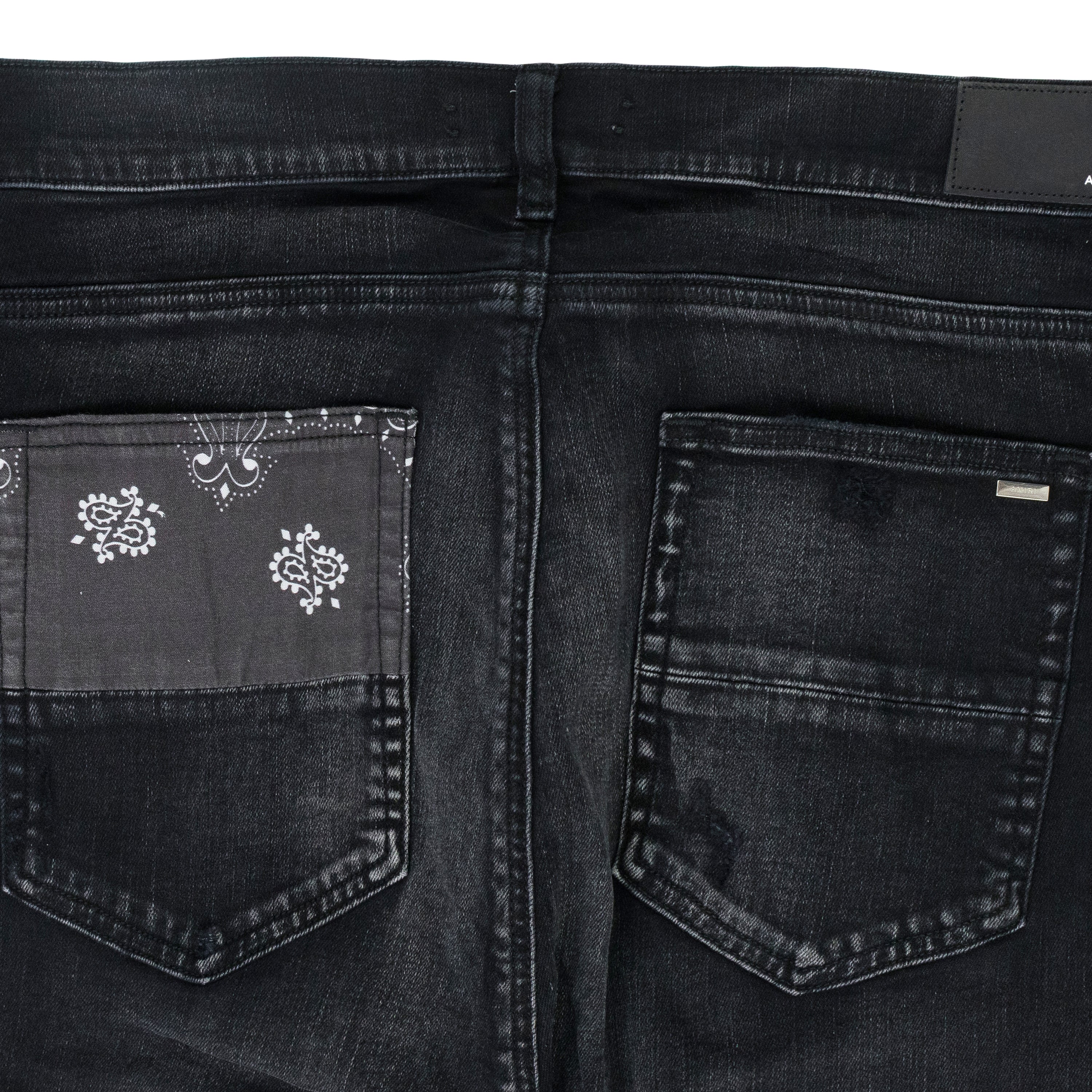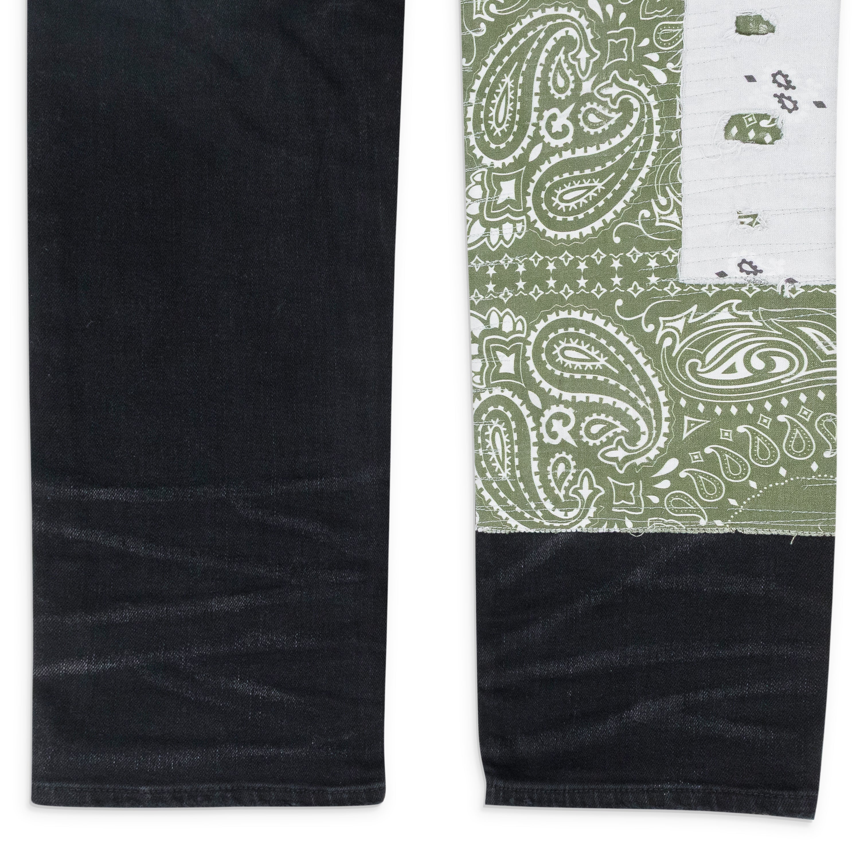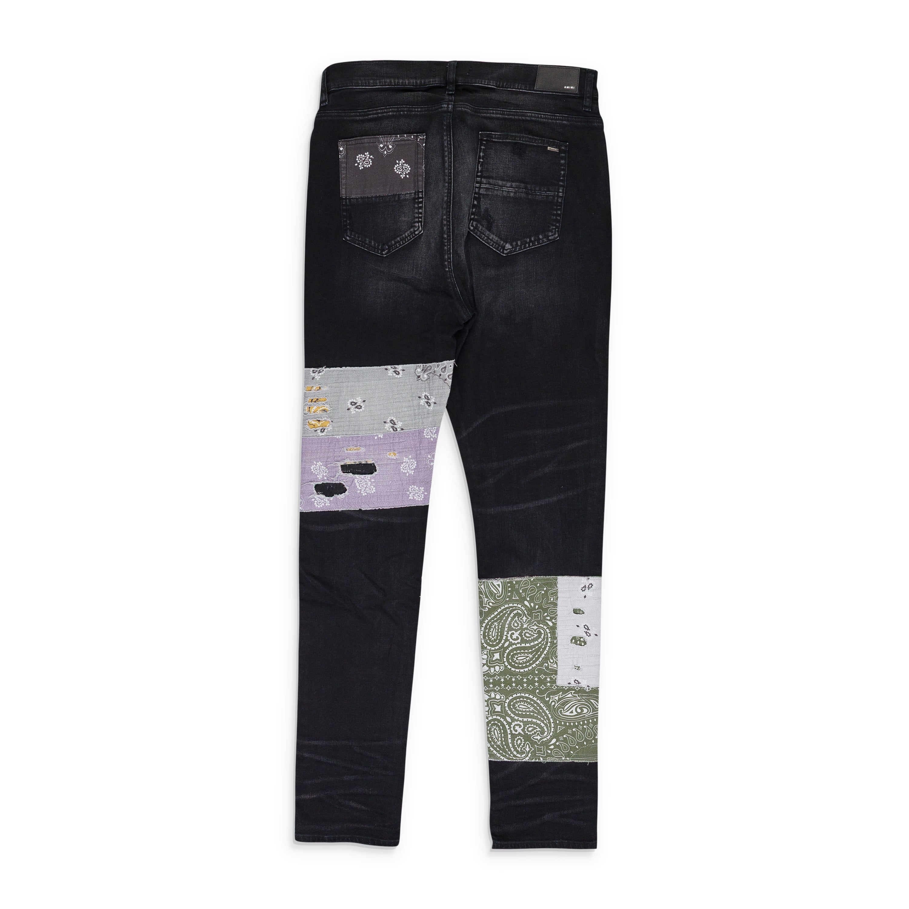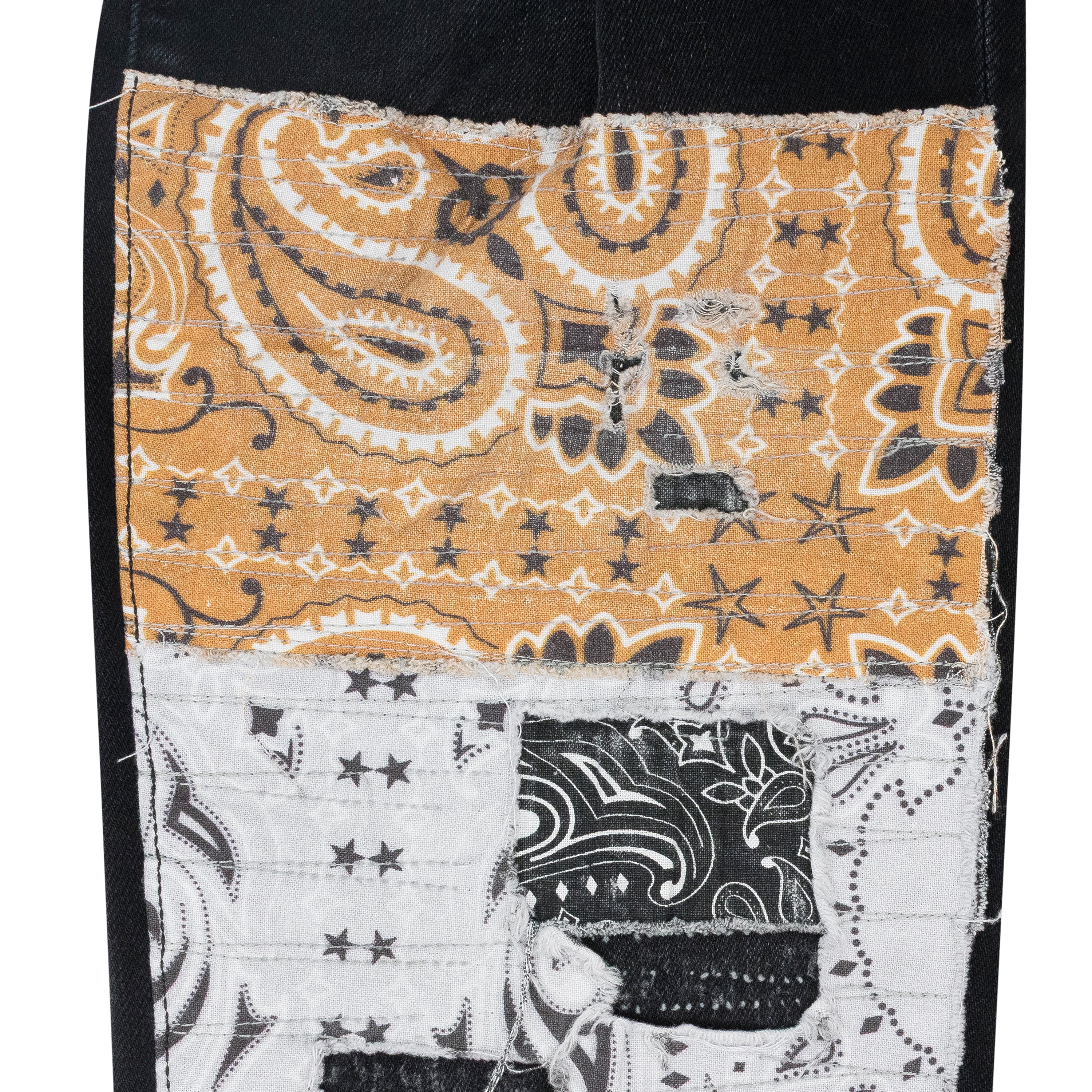 - Bandana print patches along legs, pocket, hind