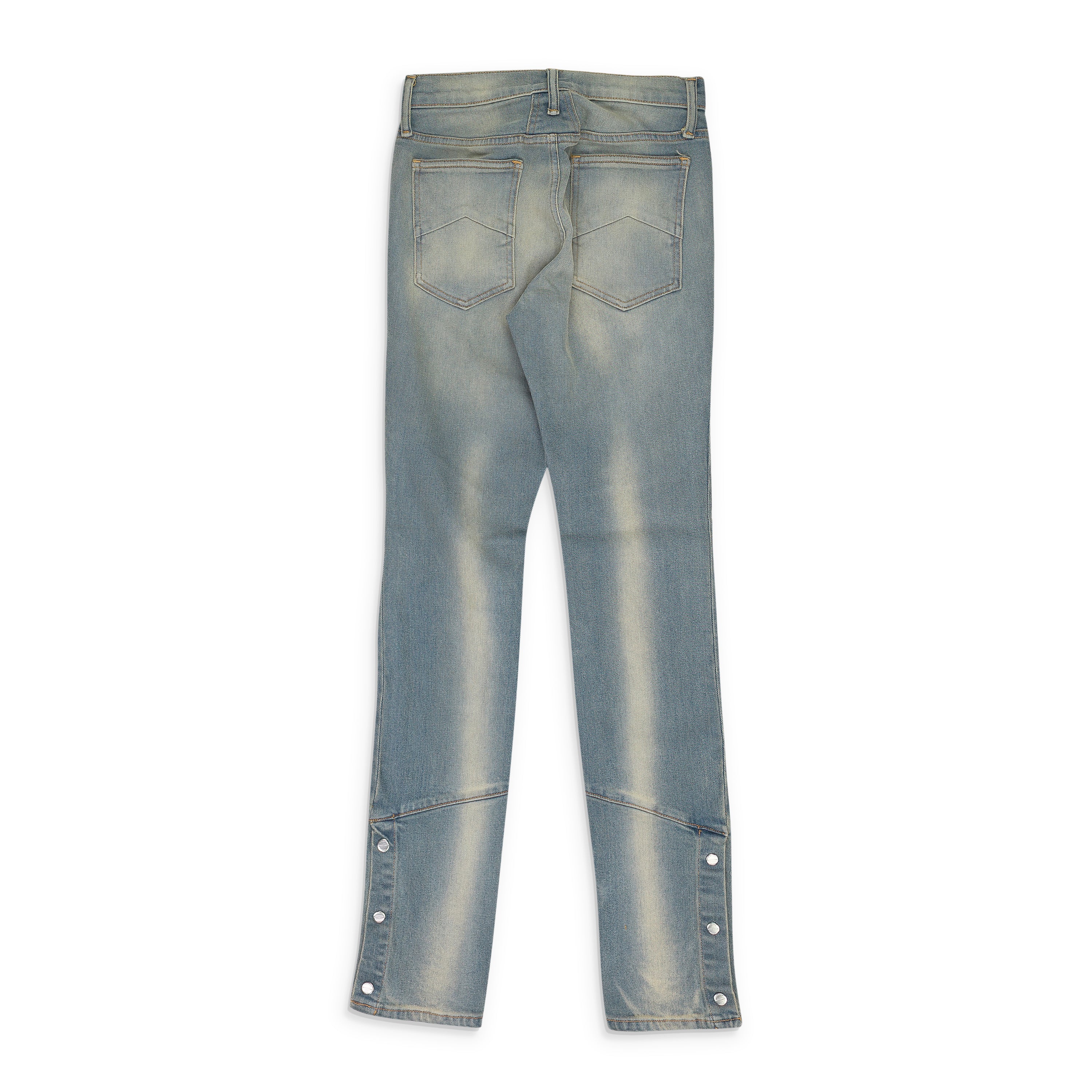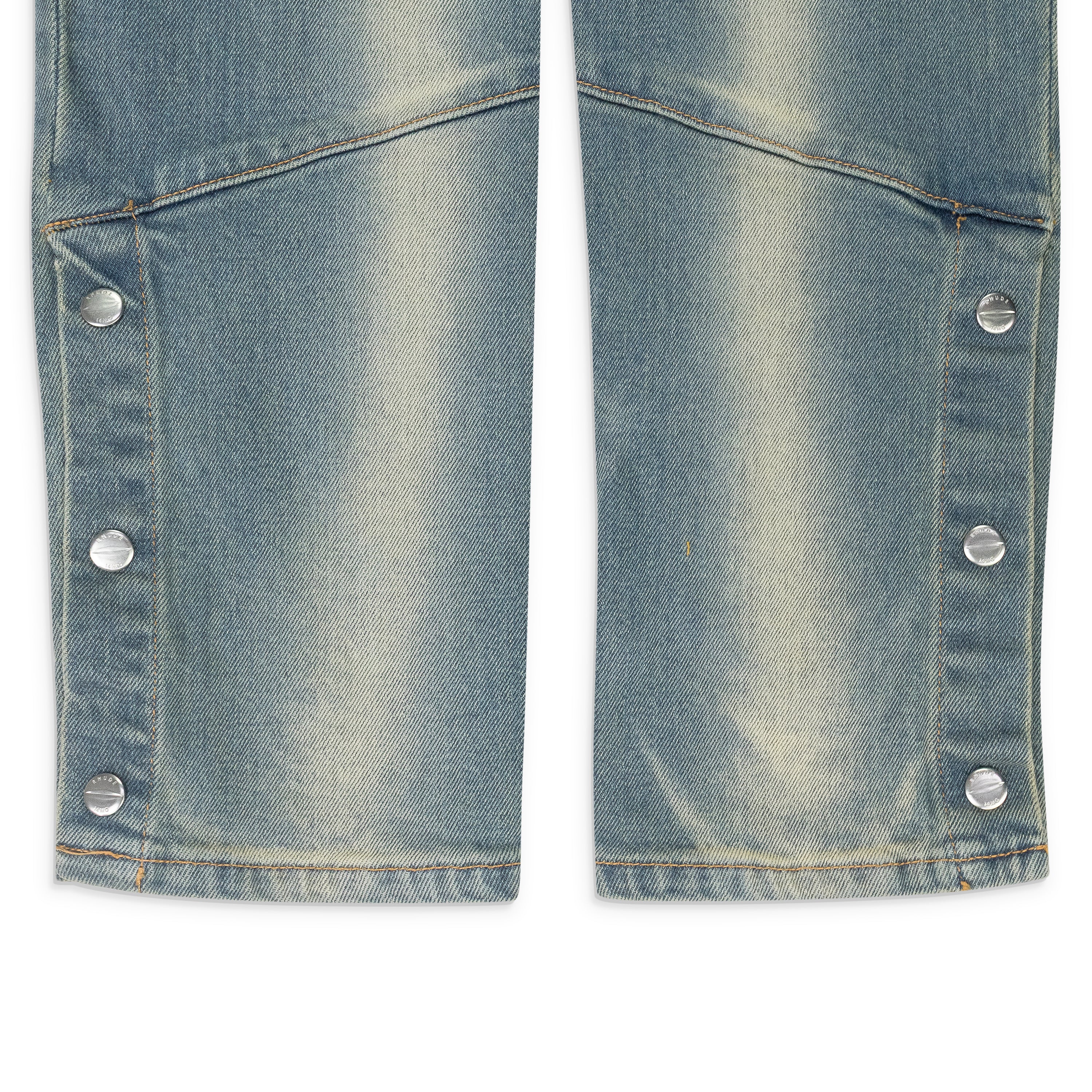 - Triple button closure at leg